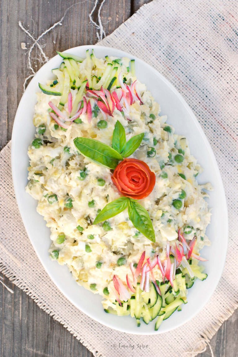 Salad Olivieh is a creamy Persian chicken and potato salad made with hard-boiled eggs, peas, and crunchy dill pickles. This classic dish is perfect as a make-ahead appetizer, sandwich filling, or easy lunch.
