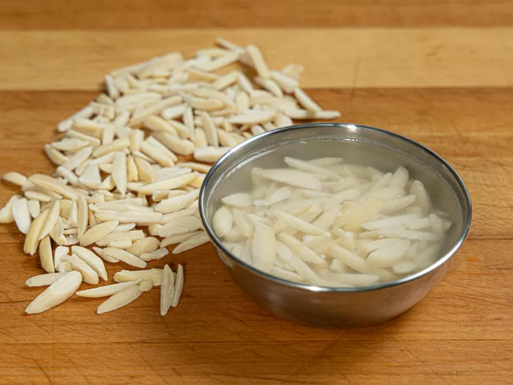 - In a small bowl, soak the slivered almonds in the rosewater; set aside.