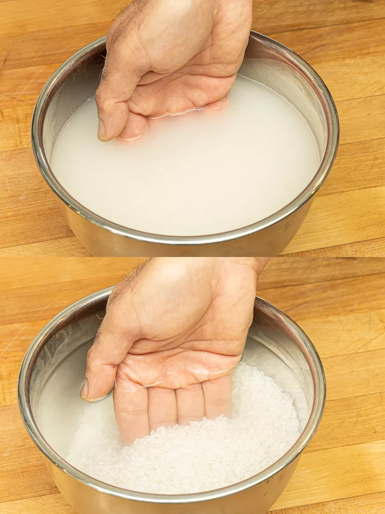 - In a large bowl, combine rice with enough cold water to cover. Using your hand, swirl the rice until the water turns cloudy. Pour off the cloudy water through a fine-mesh strainer, then return the drained rice to the bowl and refill with fresh cold water. Repeat 5 to 6 times until the water runs clear, then drain rice.